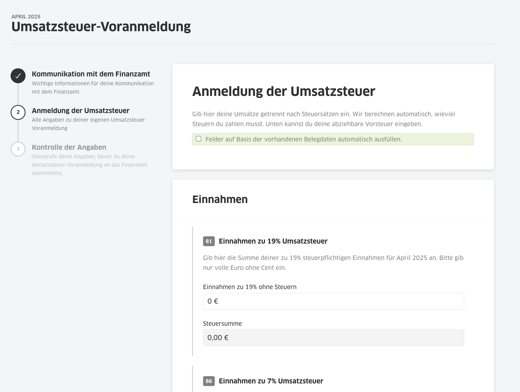 Bei der Umsatzsteuervoranmeldung trägst du in den relevanten Feldern einfach 0,00 € ein. In FastBill kannst du die Umsatzsteuervoranmeldung direkt erstellen und an dein Finanzamt übermitteln und das ganz ohne ELSTER-Zertifikat.