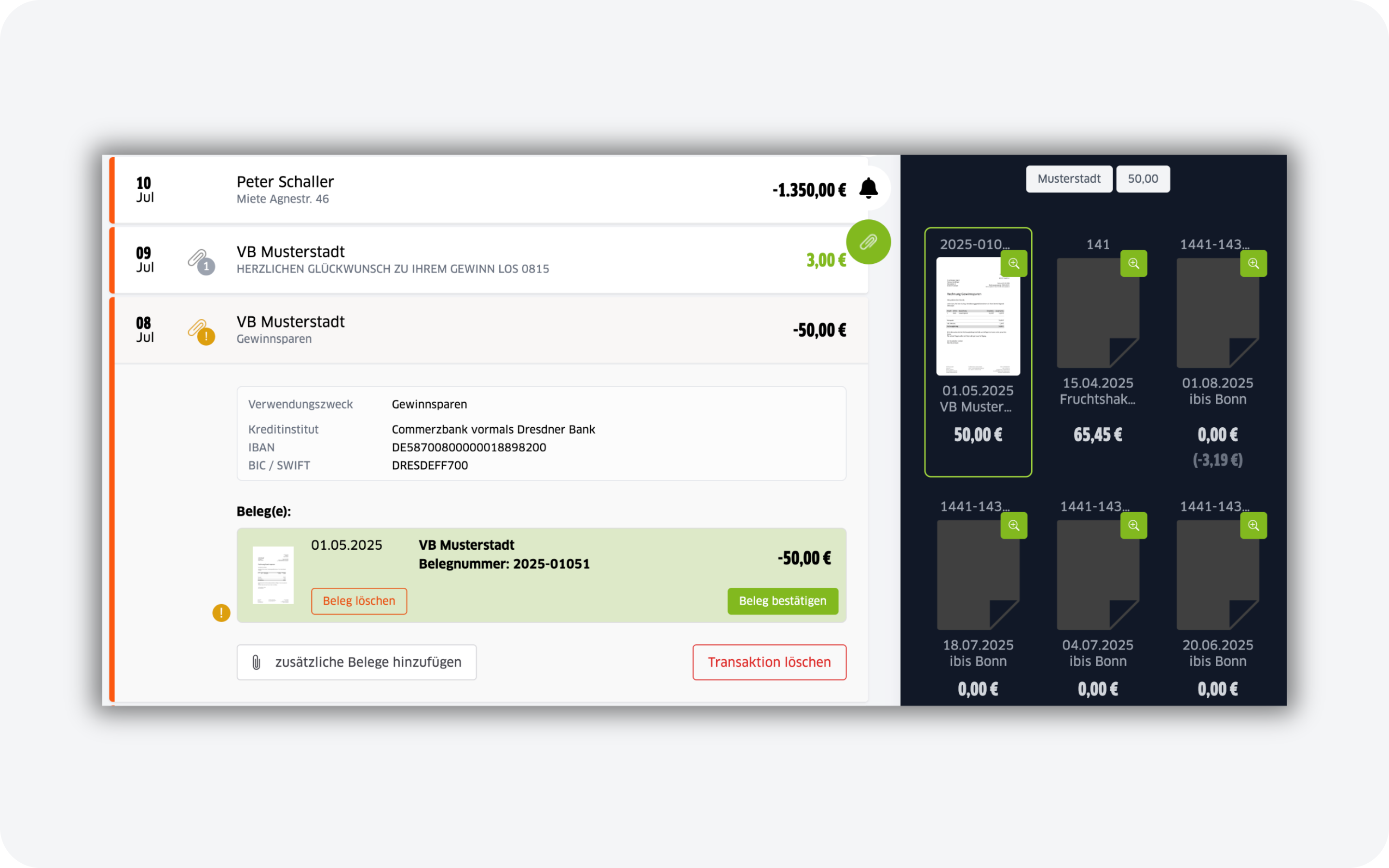 - Auch beleglose Transaktionen (z. B. Miete, interne Transfers) werden erkannt.
